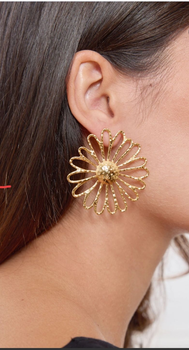 Ces boucles d’oreilles en forme de marguerite captent la lumière avec délicatesse. Leur design ajouré et martelé allie légèreté et éclat, pour un style frais et ensoleillé. Elles se portent aussi bien en journée pour illuminer une tenue simple qu’en soirée pour apporter une touche chic et pétillante.