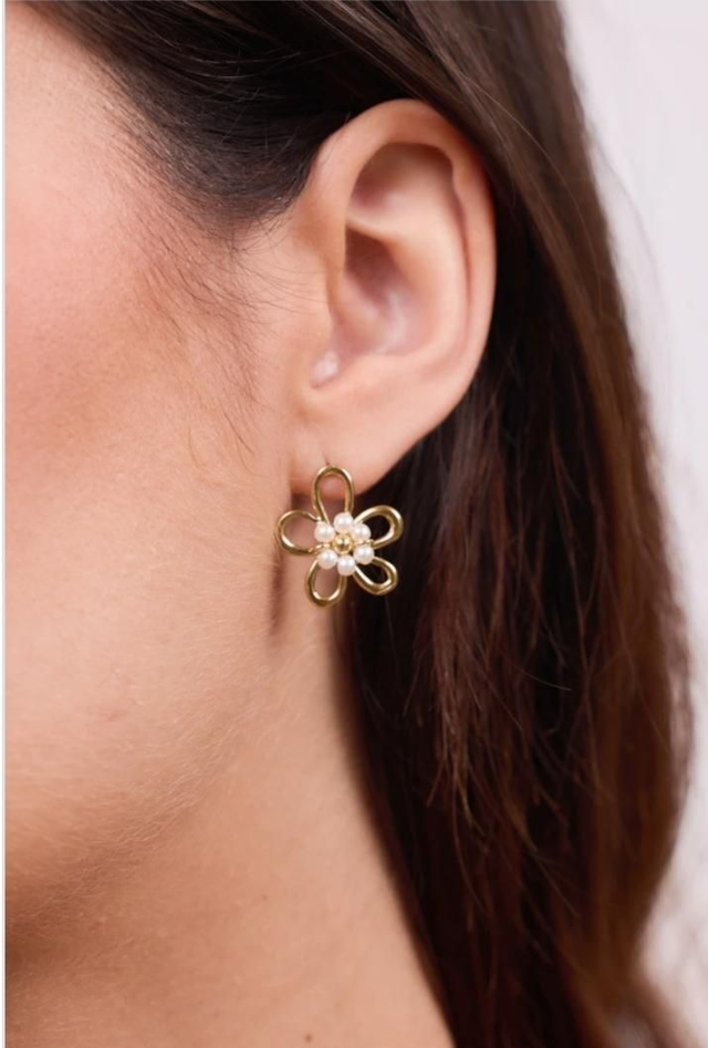 Boucles d’oreilles en forme de fleur, avec des petites perles en son cœur, pour un style délicat et raffiné.